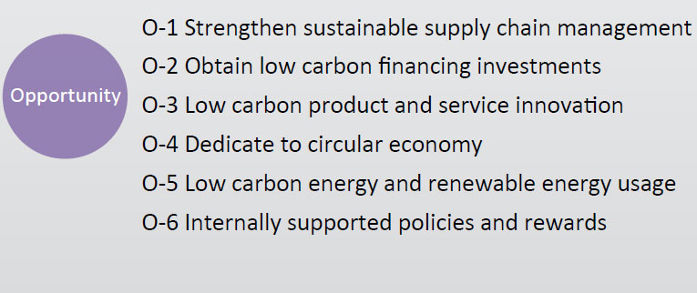 CyberTAN Technology adopts the four pillars of the Task Force on Climate-Related Financial Disclosure (TCFD) recommendations in the disclosure of our gas procurement-related information. Through discussions of each working group under the Sustainability Committee, the identification of climate-related risks and opportunities is performed for every operational aspect to evaluate the potential impacts and financial effects that might occur. Management guidelines and action plans corresponding to material risks and opportunities are developed. The objective is to strengthen the company’s climate change adaptation capability.