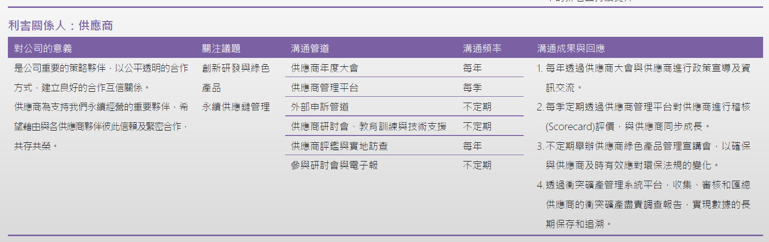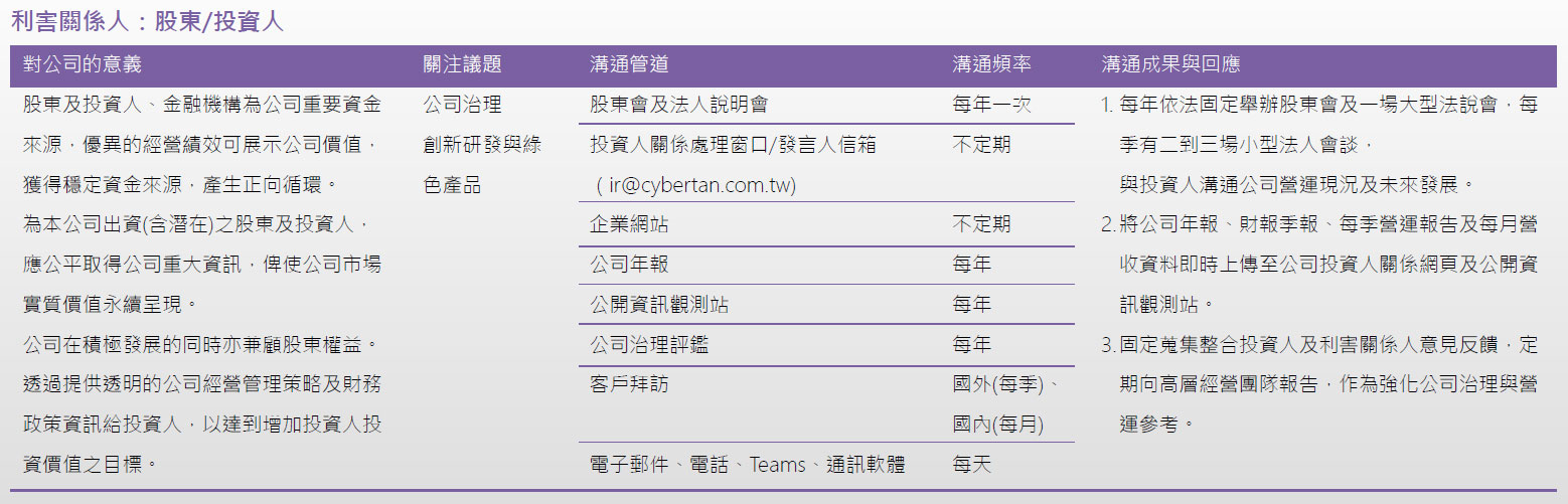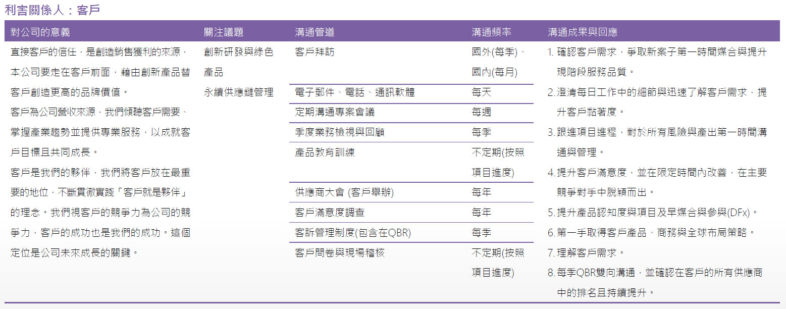 利害關係人會受到公司的活動、產品和服務影響,亦會影響公司執行策略或達成目標的能力,因此,建漢科技相當重視與利害關係人之溝通,我們依據 AA1000 利害關係人議合標準(Stakeholder Engagement Standard, SES)之五大原則:影響力、關注度、責任、依賴度和多元觀點,並參考同業辨別之利害關係人全體,選擇重要利害關係人,鑑別出五大類主要的利害關係人,分別為客戶、股東/投資人、員工/求職者、供應商、主管機關,並針對不同利害關係人,依據其性質、關注之議題以及與其溝通之目的,設有不同的溝通方式與利害關係人議合,並每年定期將與各利害關係人溝通情形報告之董事會。