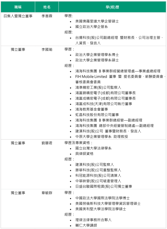 | 獨立董事 | 李國瑜 | 3 | 0 | 100 | 於113年股東會改選後新任,應出席次數3次,實際出席3次 |